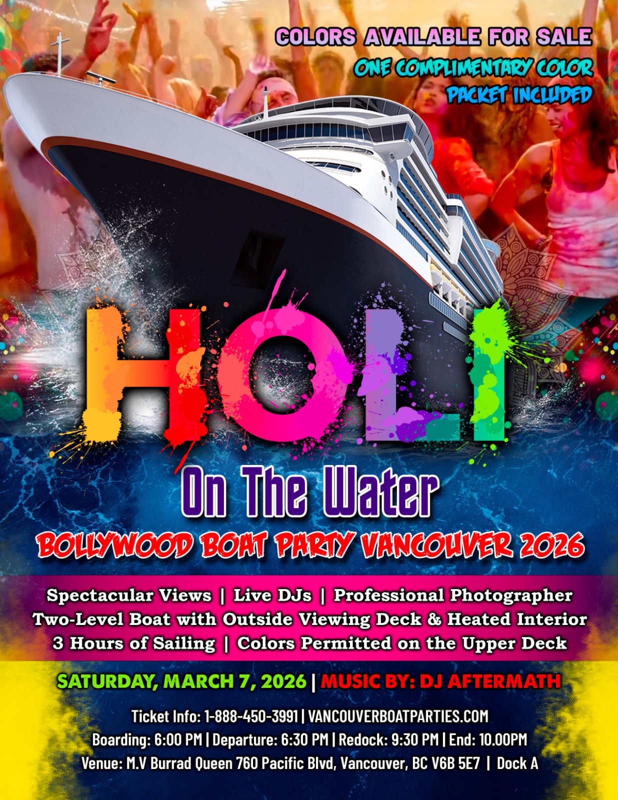 This marks our 6th Annual Holi Boat Party in Vancouver, and once tickets are sold out, there will be no additional releases.