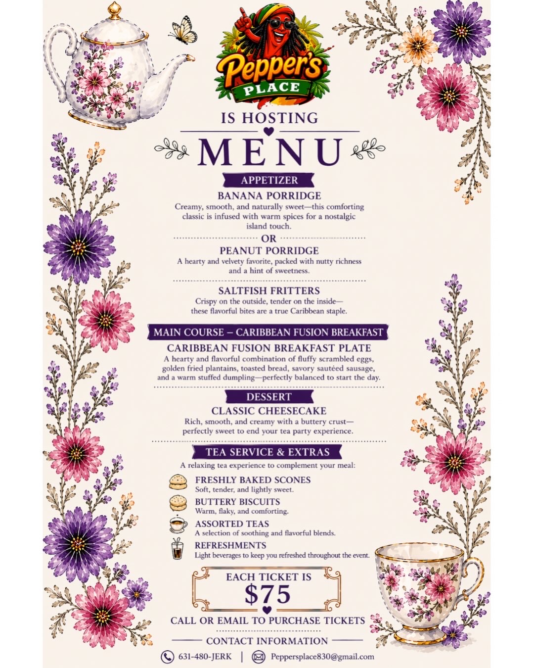 Celebrate Mother’s Day in elegance at Pepper’s Place Brunch Tea Party, a beautifully curated experience blending Caribbean flavor with a classic tea party atmosphere.
