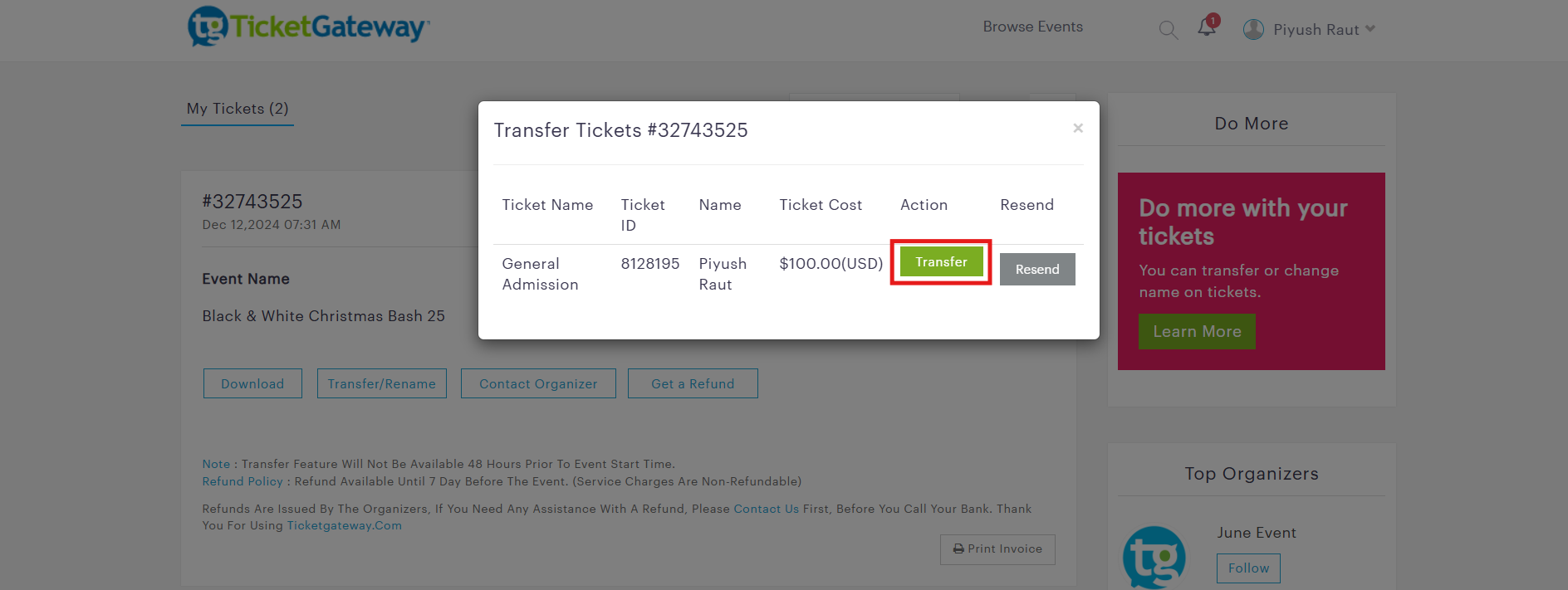 Note : Transfer feature will not be available 48 hours prior to event start time.
