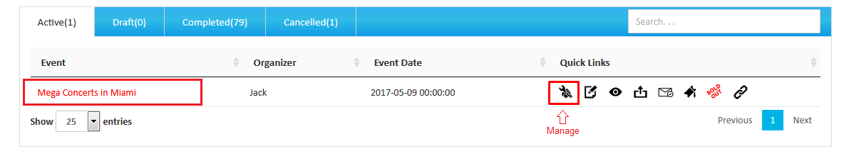 After logging in, click or tap on your event from the “Manage events” page. Then select “Manage” to go to your event dashboard.