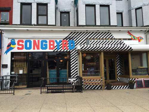 A coffeehouse/music shop with vinyl & java for sale, plus listening booths & a 1947 recording booth.